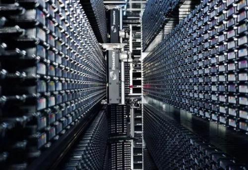 CERN計算機中心的自動磁帶存儲庫(2008年),磁帶用來存儲LHC的實驗數據,機械臂用于在存儲架和驅動器間運送磁帶,磁帶的調用完全自動化(圖片來自網絡)